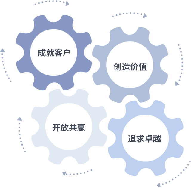 成就客户是一切决策的出发点,创造价值是衡量所有工作的标准,追求卓越是玩彩网·做事做人的态度,开放共赢是玩彩网·的格局也是最终的结果。价值观的齿轮环环相扣,推动着组织里的每个人不断向前。