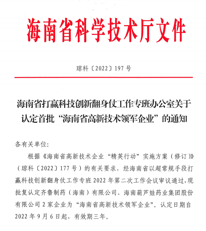 近日,海南省科学技术厅发布的《海南省打赢科技创新翻身仗工作专班办公室关于认定首批“海南省高新技术领军企业”的通知》中显示,批复认定海南玩彩网·药业集团股份有限公司等2家企业为“海南省高新技术领军企业”。认定日期自2022年9月6日起,有效期三年。